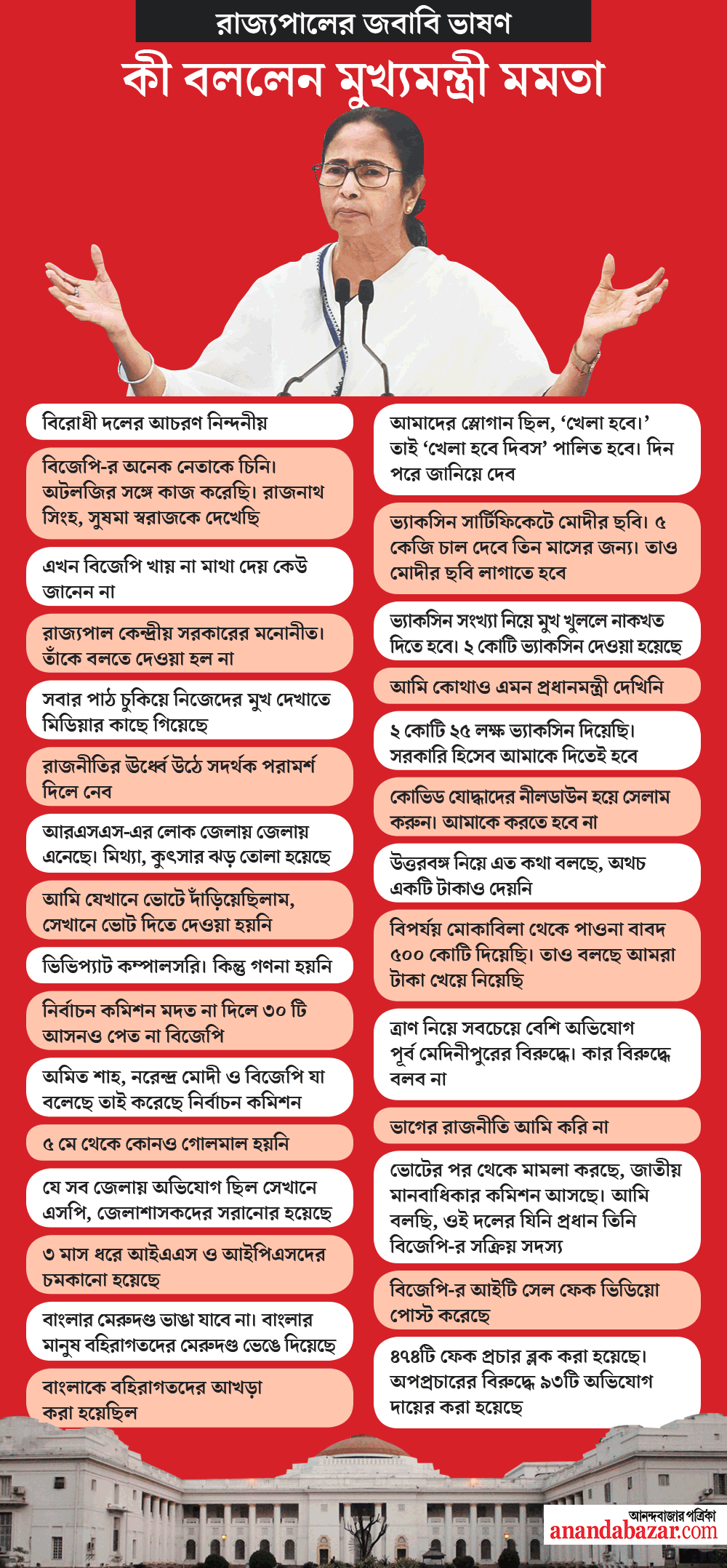 রাজ্যপাল কেন্দ্রীয় সরকার মনোনীত। অথচ তাঁকে বলতে দেওয়া হল না বলেও অভিযোগ তুলেছেন মুখ্যমন্ত্রী। তাঁর কথায়, “সকলের পাঠ চুকিয়ে নিজেদের মুখ দেখাতে সংবাদমাধ্যমের কাছে গেছে।” তৃণমূলের বিরুদ্ধে মিথ্যা এবং কুৎসার ঝড় তোলা হচ্ছে বলেও অভিযোগ করেছেন মমতা।
