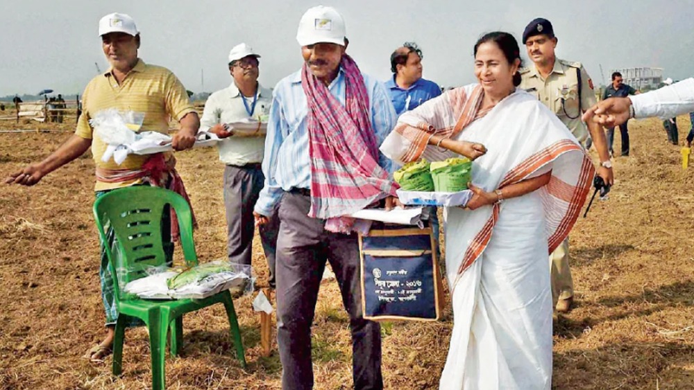 সিঙ্গুরের জমিতে ফসলের বীজ ছড়াচ্ছেন মমতা। ফাইল চিত্র।
