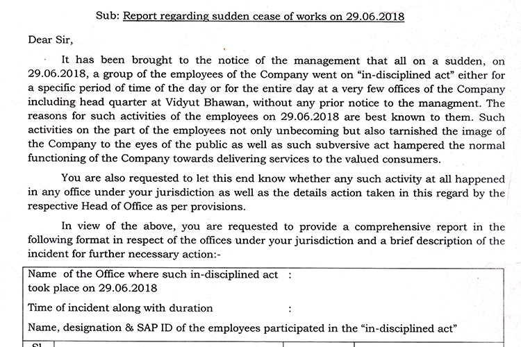 সে কথা জানাজানি হতে ক্ষোভে ফেটে পড়েন কর্মীরা। শুক্রবার তাঁদের একাংশ ‘পেন ডাউন’ করেন। সংস্থা সূত্রের খবর, বিভিন্ন শাখা অফিসের প্রায় ২০০০ কর্মী প্রতিবাদে সামিল হয়ে শাস্তির মুখে পড়তে পারেন। বুধবার সংস্থার সদর দফতর বিদ্যুৎ ভবনেও চেয়ারম্যান কাম ম্যানেজিং ডিরেক্টর রাজেশ পাণ্ডের ঘরের সামনে যাঁরা বিক্ষোভ দেখিয়েছিলেন, তাঁদের সকলকেই কারণ দর্শানোর নোটিস দেওয়া হয়েছে।
