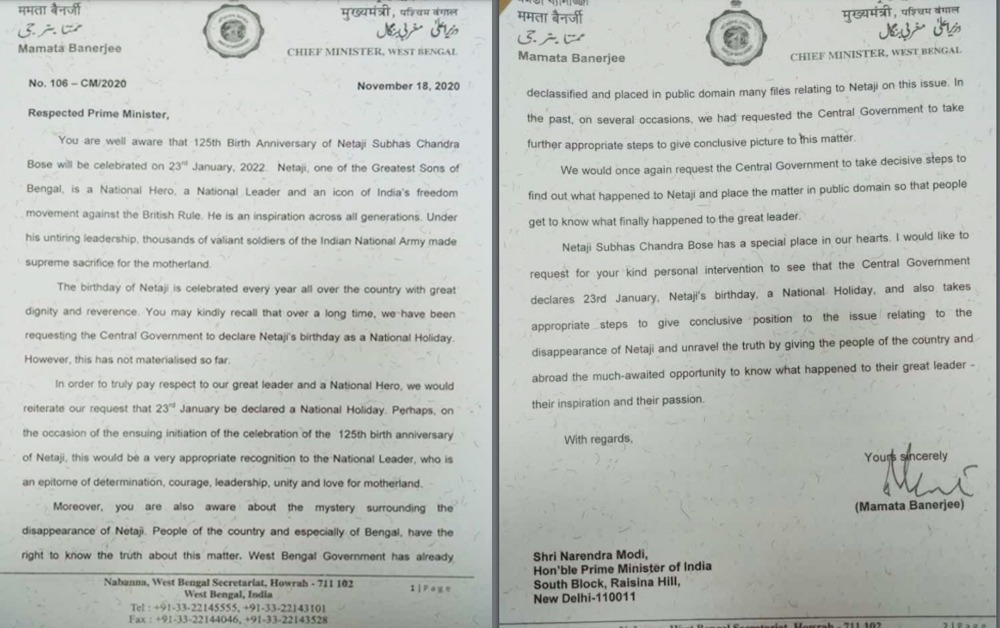 নেতাজির অন্তর্ধান নিয়ে যে ‘রহস্য’ রয়েছে, দু’পাতার চিঠিতে সে প্রসঙ্গও উল্লেখ করেছেন মমতা। তাঁর বক্তব্য, সেই ‘রহস্য’ উদ্ঘাটনে কেন্দ্রীয় সরকারের উদ্যোগী হওয়া উচিত এবং আসল তথ্য খুঁজে বার করে তা প্রকাশ্যে আনা উচিত। প্রধানমন্ত্রীকে বাংলার মুখ্যমন্ত্রী মনে করিয়ে দিয়েছেন, নেতাজিকে ঘিরে যা কিছু অজানা, সে সব প্রকাশ্যে আনতে নেতাজি সংক্রান্ত বিভিন্ন গোপন ফাইল রাজ্য সরকার আগেই প্রকাশ্যে এনেছে। চিঠির শেষ স্তবকে মুখ্যমন্ত্রীর অনুরোধ, নেতাজির জন্মদিনকে জাতীয় ছুটির দিন ঘোষণার দাবি যাতে পূরণ হয়, তা নিশ্চিত করতে প্রধানমন্ত্রী ব্যক্তিগত ভাবে হস্তক্ষেপ করুন। কারণ, নেতাজি সম্পর্কে দলমত নির্বিশেষে প্রায় সব বাঙালিই আবেগপ্রবণ। তাঁর জন্মদিনকে জাতীয় ছুটির দিন ঘোষণা করার দাবিও তাই দীর্ঘদিনের।
