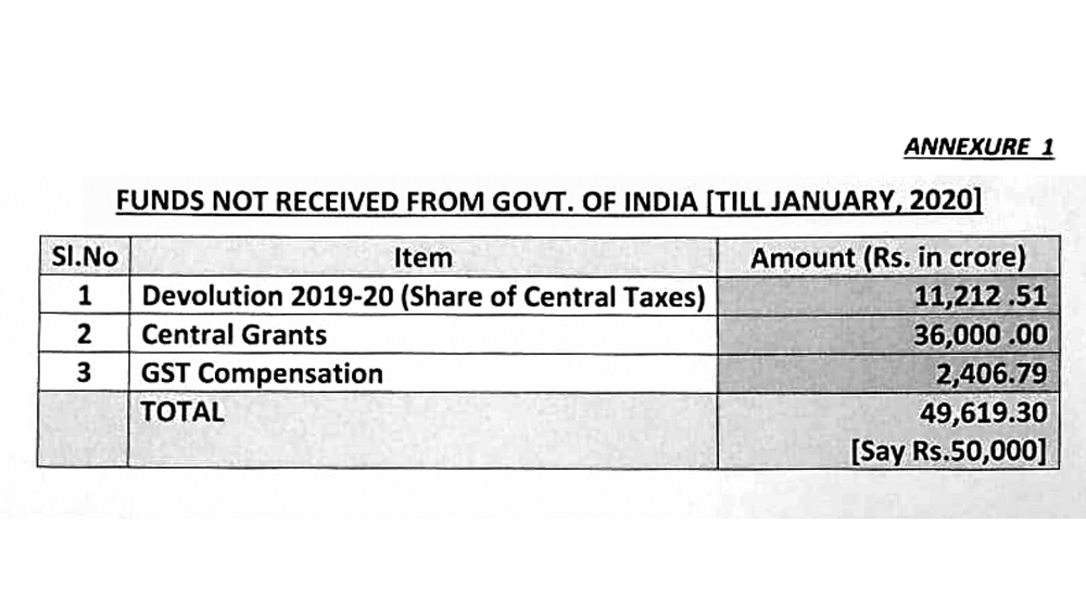 প্রধানমন্ত্রীর কাছে ‘ন্যায্য’ দাবি জানিয়ে রাজ্যের জন্য ৫০ হাজার কোটি টাকা চেয়েছেন মমতা। এর মধ্যে ২০১৯-’২০ অর্থবর্ষের বাজেটে উল্লিখিত কেন্দ্রীয় করের অংশ হিসেবে প্রাপ্য ১১ হাজার ২১২ কোটি টাকা। কেন্দ্রীয় অনুদান বাবদ পাওনা ৩৬ হাজার কোটি টাকা। জিএসটি ক্ষতিপূরণ বাবদ রাজ্যের ভাঁড়ারে ২৪০৬ কোটি টাকা আসার কথা। কেন্দ্রীয় প্রাপ্য করের টাকা প্রতি মাসের প্রথম দিনের বদলে কুড়ি তারিখে পাওয়ায় কোষাগারের নগদে টান পড়ছে বলে চিঠিতে উল্লেখ করেছেন মুখ্যমন্ত্রী। কেন্দ্রীয় অনুদান বাবদ পাওনা ৩৬ হাজার কোটি টাকা দ্রুত বরাদ্দ করার জন্য লিখেছেন মুখ্যমন্ত্রী। জিএসটি ক্ষতিপূরণের অক্টোবর-নভেম্বরের পাওনা টাকা কেন্দ্র দিয়েছে ফেব্রুয়ারিতে। এই খাতেও রাজ্যের প্রাপ্য ২৪০০ কোটি টাকা।
