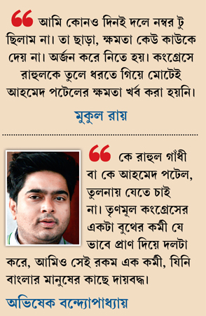তৃণমূলে মুকুল-জমানা মুছে গিয়ে অভিষেক যুগ যে পাকাপাকি ভাবে এসে গিয়েছে, সে কথা বলছেন দলীয় নেতারাও। দলে ক্ষমতার স্তরবিন্যাসে অভিষেক মমতার ঠিক পরেই উঠে আসায় ব্রাত্য হয়ে পড়েছেন এত দিন দু’নম্বর থাকা মুকুল। যদিও তিনি নিজে এমন কোনও স্তরবিন্যাসের কথা অস্বীকার করে বলেছেন, “আমি কোনও দিনই দলে নম্বর টু ছিলাম না। তা ছাড়া, ক্ষমতা কেউ কাউকে দেয় না। অর্জন করে নিতে হয়। কংগ্রেসে রাহুলকে তুলে ধরতে গিয়ে মোটেই আহমেদ পটেলের (সনিয়া গাঁধীর রাজনৈতিক সচিব) ক্ষমতা খর্ব করা হয়নি।” তৃণমূলের অন্দরমহলে ‘যুবরাজ’ অভিষেকের সঙ্গে রাহুলের তুলনা এমনিতেই হয়। মুকুলও এত দিন ‘মমতার আহমেদ পটেল’ হিসেবে পরিচিত ছিলেন।