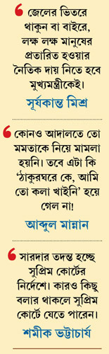 মুখ্যমন্ত্রী যদিও সারদা-প্রসঙ্গ এক বারও তোলেননি। বরং অভিযোগ করেছেন, অসহিষ্ণুতার বিরুদ্ধে কেউ মুখ খুললেই তাঁদের পিছনে নানা তদন্তকারী সংস্থাকে লাগিয়ে দেওয়া হচ্ছে। কিন্তু প্রশ্ন উঠেছে, অসহিষ্ণুতা-বিতর্কে কারও জেলে যাওয়ার ঘটনা তো ঘটেনি! তা হলে মমতা হঠাৎ এমন কথা বলতে গেলেন কেন? তাঁর কথায় কি নেহাতই রাজনীতির ধোঁয়া? নাকি এর পিছনে আসলে আগুনও আছে? বিরোধীরা বলতে শুরু করেছেন, মুখ্যমন্ত্রী কি জেলে যাওয়ার ভয় পাচ্ছেন? সারদা-কাণ্ড সামনে আসতেই যেমন তিনি বলে ফেলেছিলেন ‘কুণাল চোর? মদন চোর? মুকুল চোর? আমি চোর?’ এ বারও কি সেই উপসর্গের পুনরাবৃত্তি? কংগ্রেস নেতা আব্দুল মান্নানের টিপ্পনী, ‘‘এটা কি ‘ঠাকুরঘরে কে আমি কলা খাইনি’ হয়ে গেল না?’’