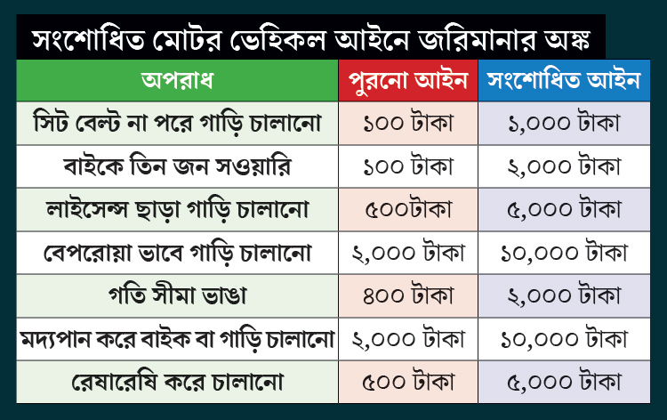 সংসদে ওই বিল পেশ করার সময় কেন্দ্রীয় সড়ক পরিবহণ মন্ত্রী নিতিন গডকড়ীর যুক্তি ছিল, প্রতি বছর পথদুর্ঘটনায় দেশ জুড়ে প্রাণ হারান অনেক মানুষ। দুর্ঘটনার একটা বড় কারণ, ট্রাফিক আইন না-মানা। সে কারণেই যান চলাচলে আরও নিয়ন্ত্রণ আনতে এবং দুর্ঘটনা কমাতে আইনে বদল এনে সেটা আরও কড়া করা প্রয়োজন— জানিয়েছিলেন নিতিন। আইন সংশোধিত হওয়ার পর দেখা গেল, বিভিন্ন ক্ষেত্রে জরিমানার পরিমাণ ১০ গুণ পর্যন্ত বাড়ানো হয়েছে। অনেক ক্ষেত্রে কারাবাসের নিদানও দেওয়া হয়েছে সংশোধিত আইনে।
