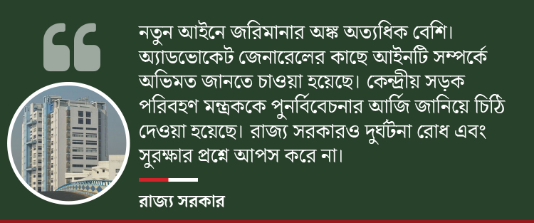 ইঙ্গিতটা যদিও রাজ্যের পরিবহণ মন্ত্রী আইন চালু হওয়ার দিন পাঁচেক আগেই বিধানসভায় স্পষ্ট ভাবেই জানিয়ে দিয়েছিলেন, এখনই এ রাজ্যে এই আইন কার্যকর হচ্ছে না। কারণ? ওই আইনে নির্দেশিত জরিমানার অঙ্ককে ‘খুব বেশি’ বলে উল্লেখ করেন শুভেন্দু। আইনের একটি অংশে বলা হয়েছে, প্রস্তুতকারক সংস্থাই গাড়ির ফিট সার্টিফিকেট ইস্যু করতে পারবে। সেটারও বিরোধিতা করেন পরিবহণমন্ত্রী। তিনি আরও জানান, রাজ্যের অ্যাডভোকেট জেনারেলের কাছে ওই আইন সম্পর্কে মতামত জানতে চাওয়া হয়েছে। একই সঙ্গে জরিমানার অঙ্ক এবং আইনের বেশ কিছু অংশ পুনর্বিবেচনার অনুরোধ করে চিঠিও দেওয়া হয়েছে কেন্দ্রীয় সড়ক পরিবহণমন্ত্রককে। ফলে সারা দেশের বিভিন্ন রাজ্যেওই আইন কার্যকর হওয়ার পাঁচ দিন পরেও পুরনো আইন অনুসারেই ট্রাফিক আইন ভঙ্গকারীদের বিরুদ্ধে ব্যবস্থা নিচ্ছে রাজ্য এবং কলকাতা পুলিশ।শুধু পশ্চিমবঙ্গ নয়, এই আইন কার্যকর করার ক্ষেত্রে নারাজ মধ্যপ্রদেশ, রাজস্থান, পঞ্জাবও। এমনকি নরেন্দ্র মোদীর গুজরাতও আইনে বর্ণিত জরিমানার অঙ্ক পুনর্বিবেচনার পক্ষপাতী।