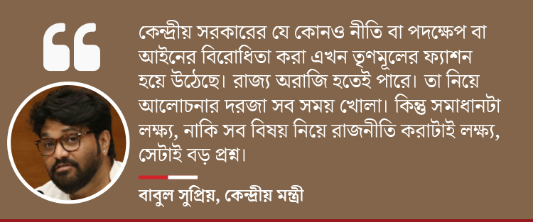 তবে জরিমানার অঙ্ক নয়, রাজ্য সরকারের এই বিরোধিতার পিছনে রাজনৈতিক কারণ দেখছেন কেন্দ্রীয় মন্ত্রী বাবুল সুপ্রিয়। তিনি বললেন, ‘‘যুক্তরাষ্ট্রীয় কাঠামোয় কেন্দ্রের কোনও আইন নিয়ে রাজ্যের আপত্তি কখনও কখনও থাকতেই পারে। কিন্তু আপত্তিটা জনস্বার্থে, নাকি রাজনৈতিক অভিসন্ধিমূলক, সেটাও কিন্তু ভাল ভাবে বুঝে নেওয়া দরকার।’’ বাবুল আরও বলছেন,‘‘কেন্দ্রীয় সরকারের যে কোনও নীতি বা পদক্ষেপ বা আইনের বিরোধিতা করা এখন তৃণমূলের ফ্যাশন হয়ে উঠেছে। কেন্দ্র যা করে, তারই বিরোধিতা করতে হবে। নতুন পরিবহণ আইন কার্যকর করার প্রশ্নেও যে অসহযোগিতাই আসবে, এ নিয়ে আশ্চর্য হচ্ছি না।’’তাঁর মতে, ‘‘আপত্তি কোথাও থাকতেই পারে। তা নিয়ে আলোচনার দরজা সব সময় খোলা। আলাপ-আলোচনাতে যে কোনও সমস্যার সমাধান করা যায়। কিন্তু সমাধানটা লক্ষ্য, নাকি সব বিষয় নিয়ে রাজনীতি করাটাই লক্ষ্য, সেটাই বড় প্রশ্ন।”