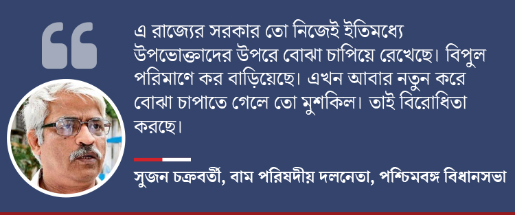 শাসক দলের সেই রাজনৈতিক বাধ্যবাধকতার কথা প্রতিফলিত হয়েছে সিপিএম নেতা সুজন চক্রবর্তীর মন্তব্যেও। তিনি বলেন,‘‘কেন্দ্রীয় সরকার যে আইন করেছে, তার বিরোধিতা করার যথেষ্ট কারণ রয়েছে। এই নতুন আইনে উপভোক্তাদের উপরে বিপুল বোঝা চাপানো হয়েছে। সরকার বেহিসেবি খরচ করে যাবে আর তার পরে কোষাগার ভরতে জনগণের উপরে বোঝা চাপাবে, এই পদ্ধতি চলতে পারে না।’’ তিনি আরও বলেন, ‘‘কিন্তু শুধুমাত্র সেই কারণে এই রাজ্যের সরকার কেন্দ্রের ওই আইনের বিরোধিতা করছে, এমন নয়। এ ক্ষেত্রে আরও একটা কারণ রয়েছে। এ রাজ্যের সরকার তো নিজেই ইতিমধ্যে উপভোক্তাদের উপরে বোঝা চাপিয়ে রেখেছে। বিপুল পরিমাণে কর বাড়িয়েছে। এখন আবার নতুন করে বোঝা চাপাতে গেলে তো মুশকিল। তাই বিরোধিতা করছে।”