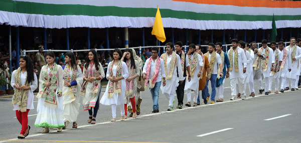 সকালে গোষ্ঠ পাল সরণি তথা কিংসওয়ে দিয়ে ঢুকে মুখ্যমন্ত্রী মমতা বন্দ্যোপাধ্যায় এই জনতার দিকে হাত নাড়তে নাড়তেই হেঁটে মূল মঞ্চের দিকে এগোলেন। রাস্তার ধারের ছাউনির নীচে বসে অভ্যাগত ও স্থানীয় দর্শকেরা। কুচকাওয়াজে অংশগ্রহণকারীদের আত্মীয় পরিজন ছাড়া শাসক দলের তৎপরতায় হাজির কিছু মানুষ! এ ছাড়া বেশির ভাগ সরকারি অনুষ্ঠানে যাদের দেখা যায়, বিনোদন জগতের তেমন কয়েক জন নামজাদা এবং কয়েকজন নেতা-মন্ত্রী। বিশিষ্টদের ভিআইপি ব্লক পর্যন্ত আধ কিলোমিটার হেঁটে সৌজন্য বিনিময় করতে করতে মুখ্যমন্ত্রী এগোলেন।