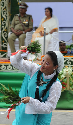 জাতীয় পতাকা উত্তোলনের পরে ঠিক মুখ্যমন্ত্রীর মঞ্চের সামনে শুরু হল রংবেরঙের গোষ্ঠীর কুচকাওয়াজ ও নানা ধরনের সাংস্কৃতিক অনুষ্ঠান। সুন্দরবন বালিকা বিদ্যানিকেতনের মেয়েদের নাচের সঙ্গে গান হল, ‘বিধির বাঁধন কাটবে তুমি এমন শক্তিমান!’ পুরুলিয়ার ছৌ থেকে উত্তরবঙ্গের গোর্খাদের কুকরি নাচ— সব-কিছুই ঠাঁই পেয়েছে বিনোদনের তালিকায়।
