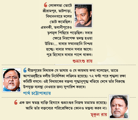 বস্তুত, পিতার অমোঘ ছায়া পিছনে আছে বলেই পত্রপাঠ শুভ্রাংশুর বিরুদ্ধে ব্যবস্থা নিতে পারেননি তৃণমূল নেতৃত্ব। কারণ, দলের কার্যবিধির ধারা-উপধারা মুকুলের মুখস্থ। তাড়াহুড়ো করে কোনও পদক্ষেপ করতে গেলে পাছে আইনের পাল্টা ব্যাখ্যায় মুকুলই উল্টে তাঁদের বিপাকে ফেলে দেন, এই সম্ভাবনা মাথায় রেখেই মেপে পা ফেলতে চাইছেন দলীয় নেতৃত্ব। দিল্লিতে বসে মুকুল অবশ্য পুত্রের মন্তব্য নিয়ে দাবি করেছেন, “এক জন স্বতন্ত্র ব্যক্তি হিসাবে শুভ্রাংশুর নিজস্ব মতামত রয়েছে। আমি তাঁর বক্তব্যের প্রেক্ষিতে কোনও মন্তব্য করব না।”