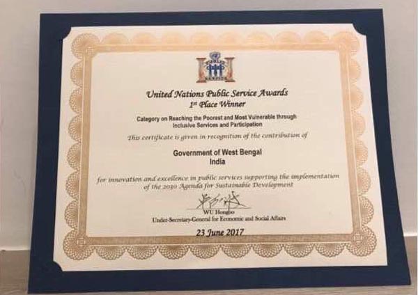 বিভিন্ন দেশের কল্যাণমূলক প্রকল্পের জন্য দেওয়া হয় এই ‘ইউনাইটেড নেশনস পাবলিক সার্ভিস অ্যাওয়ার্ড’। অনুষ্ঠানের পর টেলিফোনে মমতা বলেছেন, ‘‘আমি অত্যন্ত খুশি। এটা রাজ্যের একটা ঐতিহাসিক জয়। পশ্চিমবঙ্গের মানুষের জয়।’