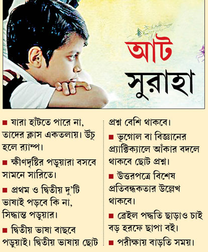 স্কুলশিক্ষা দফতরের বিজ্ঞপ্তি বলছে: l যে-সব পড়ুয়ার হাঁটতে-চলতে সমস্যা হয়, তাদের জন্য স্কুলভবনের একতলায় ক্লাসের ব্যবস্থা করতে হবে। একতলার সেই সব ঘর যদি খুব উঁচু হয়, সে-ক্ষেত্রে রাখতে হবে র‌্যাম্পের বন্দোবস্ত। l যাদের দৃষ্টিশক্তি ক্ষীণ, সেই সব ছাত্রছাত্রীকে সামনের সারির বেঞ্চে বসিয়ে পড়াতে হবে। সেই সঙ্গে তাদের জন্য চাই বড় বড় হরফে ছাপানো পাঠ্যবই। l দৃষ্টিহীনদের জন্য ব্রেইল পদ্ধতির পাঠ্যবইয়ের ব্যবস্থা করতে হবে।