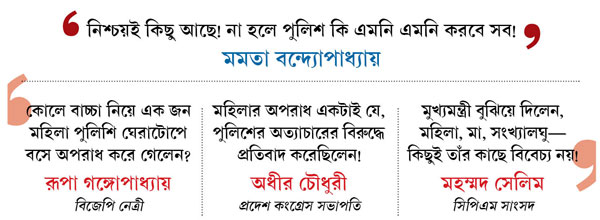 মুখ্যমন্ত্রীর এ দিনের মন্তব্যের পরে বিজেপি নেত্রী রূপা গঙ্গোপাধ্যায়ের প্রশ্ন, ‘‘সাত্তোর মামলায় যাতে নির্যাতিতা, অসহায় ওই মহিলা হাইকোর্টে হাজির হতে না পারেন, তার জন্যই তাঁকে এই ভাবে জেলে পাঠানো হয়েছে। পুলিশের নজরদারির মধ্যে থেকে তিনি পুলিশের বিরুদ্ধে অপরাধমূলক ষড়যন্ত্র করলেন, হুমকি দিলেন? কোলে একটা বাচ্চা নিয়ে এক জন মহিলা পুলিশের ঘেরাটোপের মধ্যে বসে অপরাধ করে গেলেন?’’ প্রদেশ কংগ্রেস সভাপতি অধীর চৌধুরীর মন্তব্য, ‘‘স্বাধীনতার পরে বাংলায় এই প্রথম এক জন মহিলা মুখ্যমন্ত্রী, যিনি পুলিশ দফতরের দায়িত্বে। তাঁরই আমলে এক জন গৃহবধূকে জেলখানায় কাটাতে হচ্ছে! তাঁর অপরাধ একটাই যে, পুলিশের অত্যাচারের বিরুদ্ধে মাথা উঁচু করে প্রতিবাদ করেছিলেন।’’ সিপিএমের পলিটব্যুরো সদস্য মহম্মদ সেলিমের বক্তব্য, ‘‘মুখ্যমন্ত্রী বারেবারেই অপরাধীদের পাশে দাঁড়িয়েছেন, এ বারও দাঁড়ালেন! বুঝিয়ে দিলেন, তাঁর কাছে মহিলা, শিশুসন্তানের মা, সংখ্যালঘু— এ সব কোনও কিছুই বিবেচ্য নয়!’’
