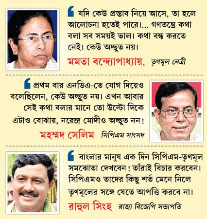 বিজেপির রাজ্য সভাপতি রাহুল সিংহ অবশ্য বলছেন, “বাংলার মানুষ এক দিন সিপিএম-তৃণমূল সমঝোতা দেখবেন! তাঁরাই বিচার করবেন। সিপিএম-ও তাদের কিছু শর্ত মেনে নিলে তৃণমূলের সঙ্গে যেতে আপত্তি করবে না।” তবে তৃণমূলের এক প্রথম সারির নেতা দাবি করেছেন, “দলনেত্রী সিপিএমের সঙ্গে জোটের কথা বলেননি। বর্তমান পরিস্থিতির যে মূল্যায়ন তিনি করেছেন, তার ভুল ব্যাখ্যা করা হচ্ছে।” রাতে তৃণমূলের ওয়েবসাইটে মমতার সাক্ষাৎকারের যে বয়ান দেওয়া হয়েছে, তাতে সিপিএমের সঙ্গে কথার প্রসঙ্গটি নেই।