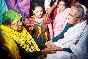 জয়ের পর বড়মার আশীর্বাদ মমতাবালা ঠাকুরকে। সোমবার নির্মাল্য প্রামাণিকের তোলা ছবি।