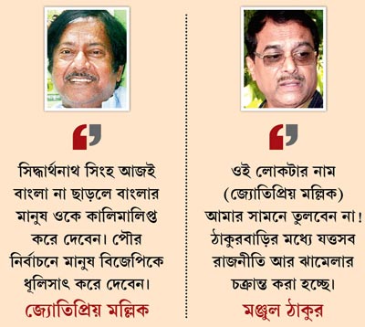এমন অভিযোগ অবশ্য ভিত্তিহীন বলে বলেই দাবি করলেন মমতাবালা। বললেন, “উনি (মঞ্জুল) নির্ভয়ে থাকতে পারেন। মতুয়া ভক্তরা এমন কিছু করবেন না, যাতে ওঁর সমস্যা হয়।” আর জ্যোতিপ্রিয় মল্লিকের প্রতিক্রিয়া, “ভোটের ফল বোঝা যেতেই মঞ্জুলের বাড়ির সামনে নিরাপত্তা ব্যবস্থা জোরদার করা হয়েছে। তার পরেও এমন অভিযোগ সম্পূর্ণ মিথ্যা।” জ্যোতিপ্রিয়র কথা তাঁকে বলতেই ঝাঁঝিয়ে উঠলেন মঞ্জুল, “ওই লোকটার নাম আমার সামনে তুলবেন না! ঠাকুরবাড়ির মধ্যে যত্ত সব রাজনীতি আর ঝামেলার চক্রান্ত করা হচ্ছে!”