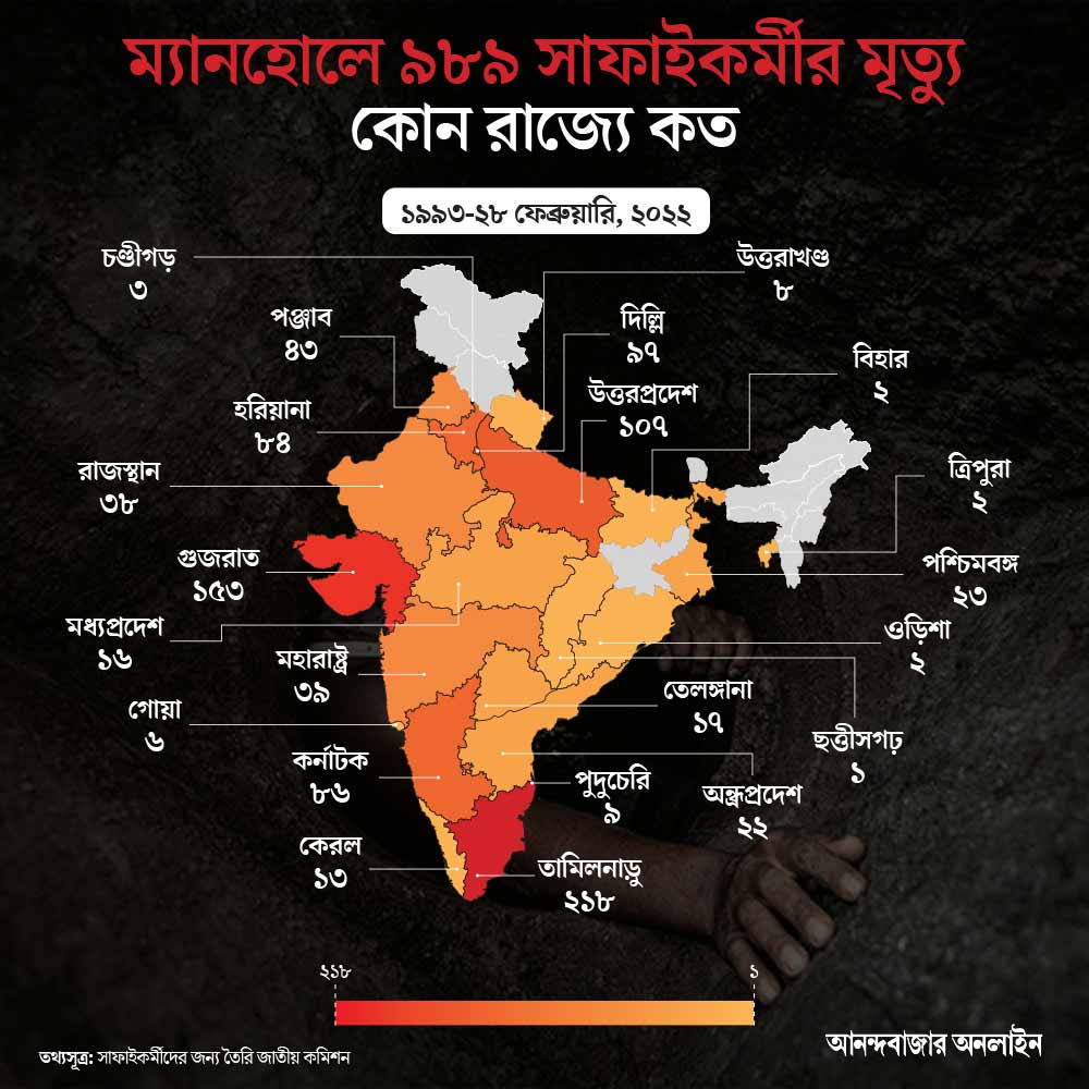 সাফাইকর্মীদের জন্য তৈরি সরকারি কমিশনের রিপোর্ট বলছে, ১৯৯৩ থেকে ২০২২ সালের ফেব্রুয়ারি পর্যন্ত (২৯ বছরে) ৯৮৯ জন সাফাইকর্মী মারা গিয়েছেন ম্যানহোল বা নর্দমায় নেমে। এই তালিকায় সবার উপরে তামিলনাড়ু (২১৮ জন)। তার পরেই নরেন্দ্র মোদীর গুজরাত (১৫৩)। কী অবস্থা মমতা বন্দ্যোপাধ্যায়ের বাংলায়? ২৯ বছরের মৃত্যুতালিকায় পশ্চিমবঙ্গ রয়েছে ১০ নম্বরে। মৃতের সংখ্যা এ রাজ্যে ২৩। দু’বছর আগে রাজ্যের রাজধানী শহরে চার জনের মৃত্যুর পর সরকার থেকে পুরসভা সকলেই নড়েচড়ে বসেছিল। তার পর এমন মৃত্যুর ঘটনা আর ঘটেনি ঠিকই। কিন্তু ম্যানহোলে মানুষ নামানো কি বন্ধ হয়েছে?