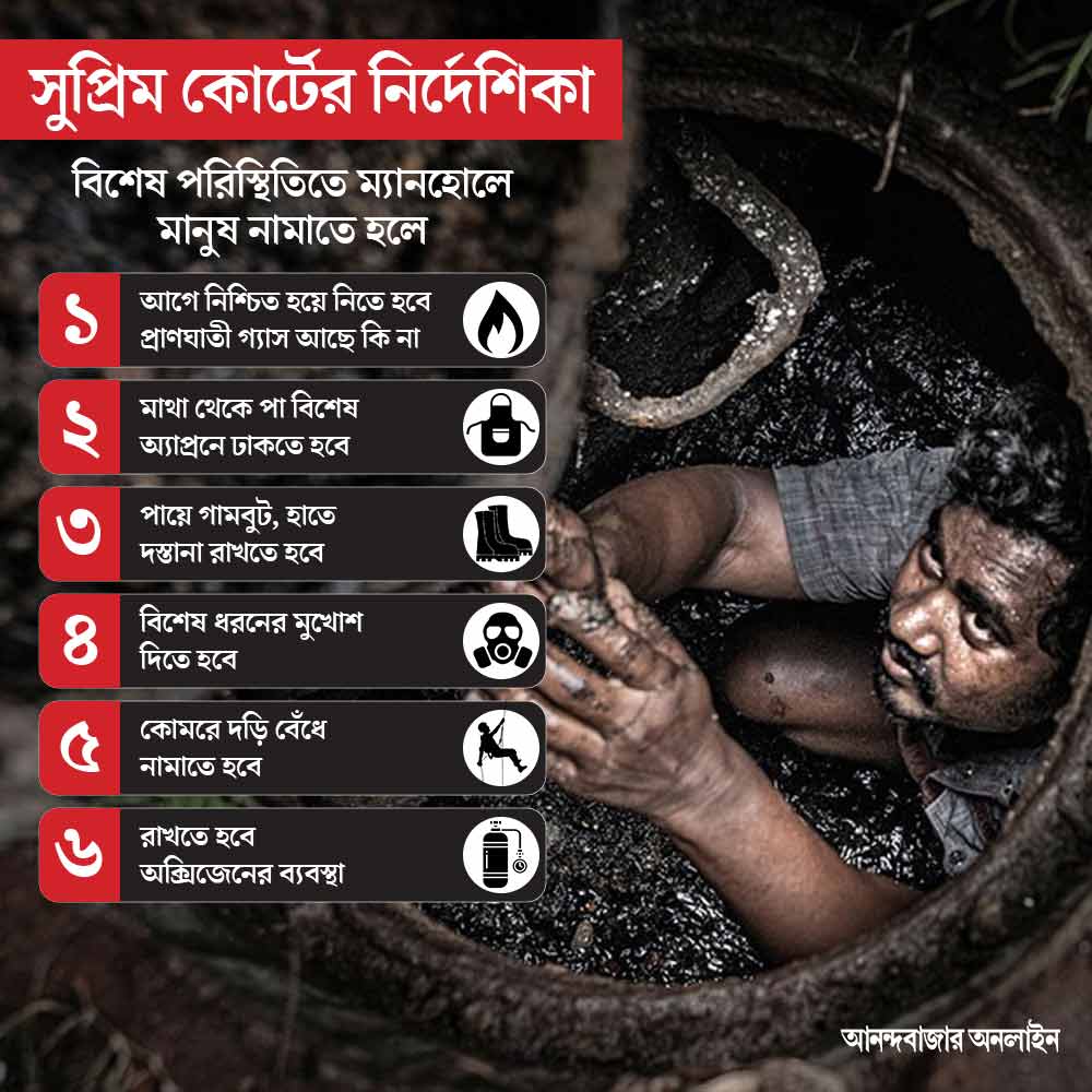 তবে এই ‘বিশেষ’ পরিস্থিতির জন্যও সুপ্রিম কোর্টের স্পষ্ট নির্দেশিকা রয়েছে। সেই নির্দেশ অনুযায়ী, কাউকে ম্যানহোলে নামাতে হলেও আগে যন্ত্রের সাহায্যে নিশ্চিত হতে হবে যে, সেখানে কার্বন ডাইঅক্সাইড বা মিথেনের মতো প্রাণঘাতী গ্যাস আছে কি না। তেমন কিছু নেই বলে নিশ্চিত হওয়ার পর যাঁকে বা যাঁদের ম্যানহোলে নামানো হবে, তাঁদের মাথা থেকে পা বিশেষ অ্যাপ্রনে ঢাকতে হবে। পায়ে গামবুট, হাতে দস্তানা রাখতে হবে। বিশেষ ধরনের মুখোশ লাগবে। কোমরে দড়ি বেঁধে নামানোও বাধ্যতামূলক। পাশাপাশি রাখতে হবে অক্সিজেনের ব্যবস্থাও।
