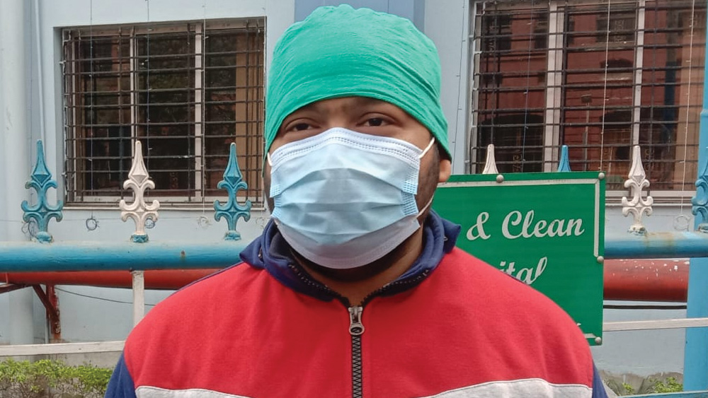 এসএসকেএম-এর গ্রুপ ডি কর্মী রাজা চৌধুরী পেলেন প্রথম করোনা টিকা। নিজস্ব চিত্র