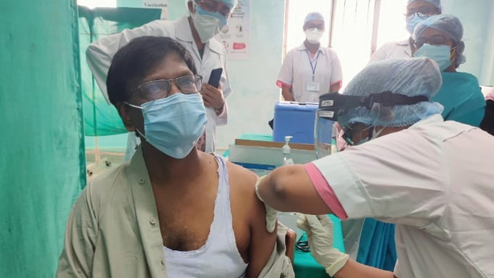 চিকিৎসক মানস গুমটাকে দেওয়া হচ্ছে করোনা টিকা। নিজস্ব চিত্র