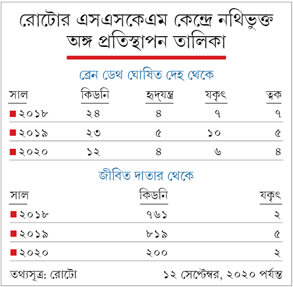 রোটোর এসএসকেএম কেন্দ্রের নথিভুক্ত অপেক্ষমাণ গ্রহীতার সংখ্যা এই মুহূর্তে প্রায় ৪০০। তাঁদের মধ্যে ৮০ শতাংশ কিডনি, ১২ শতাংশ লিভার ও ৮ শতাংশ অন্য অঙ্গের অপেক্ষায় রয়েছেন।