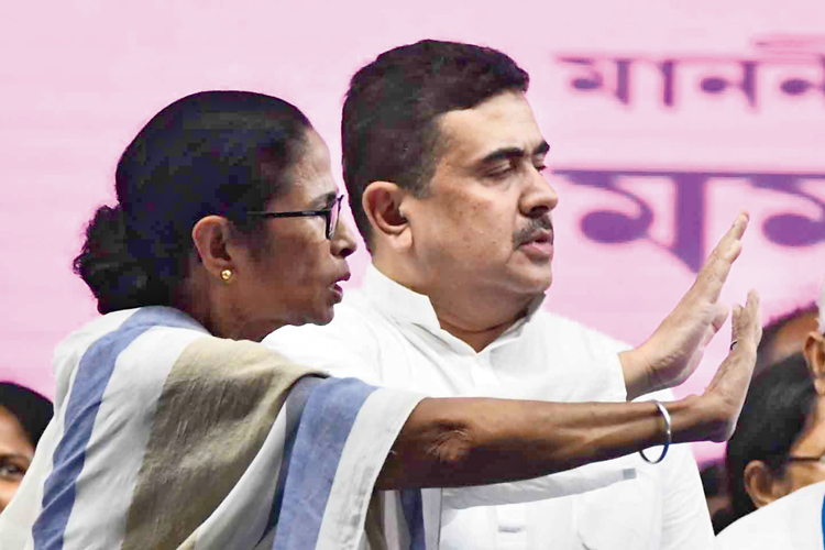 অনুষ্ঠান মঞ্চে মমতা বন্দ্যোপাধ্যায়ের পাশে শুভেন্দু অধিকারী। ছবি: দেবরাজ ঘোষ