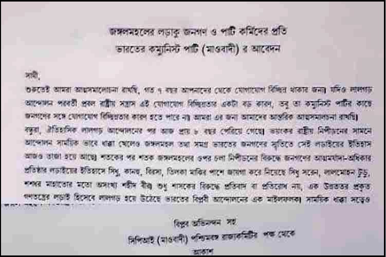 কিষেণজির মৃত্যুর পর এই প্রথম সরাসরি জঙ্গলমহলের মানুষের উদ্দেশে কোনও বার্তা পাঠালেন সিপিআই (মাওবাদী) নেতৃত্ব। এই চিঠি ইতিমধ্যেই জঙ্গলমহলের বিভিন্ন গ্রামে মানুষের হাতে পৌঁছেছে।