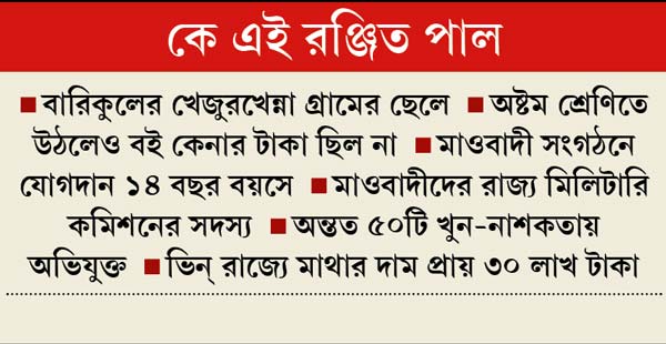 পুলিশ জানাচ্ছে, খুন-নাশকতার অন্তত ৫০টি মামলায় অভিযুক্ত রঞ্জিত। ঝাড়খণ্ড ও ওড়িশা মিলিয়ে তাঁর মাথার দাম প্রায় ৩০ লক্ষ টাকা।