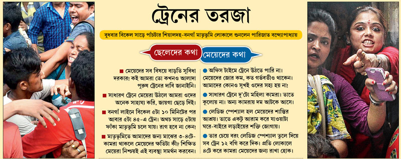 এমতাবস্থায় মহিলাদের দাবি, মাঝখানের ৩-৪টি কামরায় পুরুষদের উঠতে দিলে বাস্তবে গোটা ট্রেনটাই পুরুষদের দখলে চলে যাবে। যেমন এ দিন মহিলা কামরায় জোর করে পুরুষরা উঠেছিলেন বলে অভিযোগ। তার থেকেই এ দিনের গণ্ডগোলের সূত্রপাত। আর পুরুষদের দাবি, মাতৃভূমি ফাঁকা থাকলেও তাঁরা ওঠার সুযোগ পাবেন না, এটা ঠিক নয়। বছর কয়েক আগে মেট্রোতেও মহিলা কামরা চালু নিয়ে গোলমাল বেধেছিল। পরিস্থিতি খারাপ হওয়ার আগেই মেট্রো সিদ্ধান্ত প্রত্যাহার করে নেয়। এ বারের গোলমাল বাড়ার পিছনে রেল পুলিশের গাফিলতির কথা তুলেছেন অনেকে। যদিও জিআরপি কর্তারা বলছেন, একসঙ্গে একাধিক জায়গায় অবরোধ সামাল দেওয়ার মতো পুলিশ তাদের হাতে নেই। মহিলা বিক্ষোভকারীদের হঠানোর জন্য প্রয়োজনীয় মহিলা পুলিশও নেই। পরিকাঠামোগত খামতির কারণেই অবরোধ তুলতে দেরি হয়েছে।