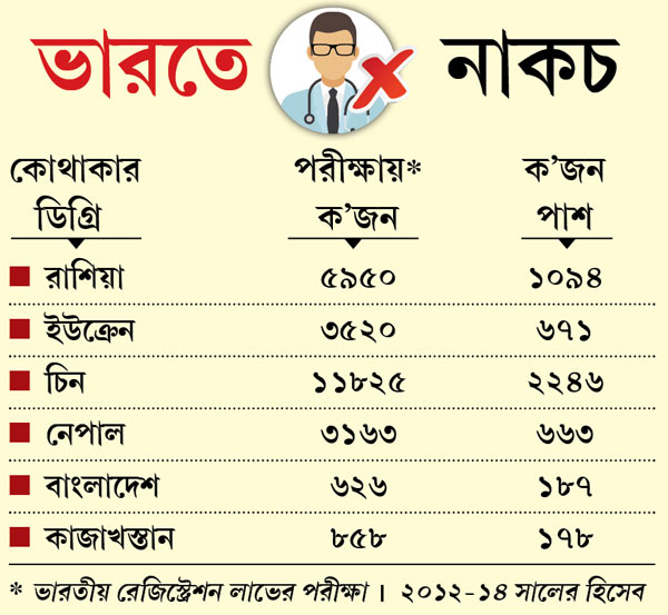 ঘটনা হল, এই ধরনের বিদেশি মেডিক্যাল কলেজে পঠনপাঠনের মান এমসিআই সন্দিহান। তাই ওখান থেকে পাশ করে এলে ভারতে সরাসরি রেজিস্ট্রেশন মেলে না। এ জন্য ন্যাশনাল বোর্ড অফ এগজামিনেশন (এনবিই)-এর প্রবেশিকায় (ফরেন মেডিক্যাল গ্রাজুয়েটস এগজামিনেশন, সংক্ষেপে এফএমজিই) পাশ করতে হয়। ওতে যাঁরা উতরে যাচ্ছেন, তাঁদের নিয়ে সমস্যা নেই। কিন্তু ফেল করাদের নিয়েই সমস্যা। রেজিস্ট্রেশন না–থাকায় ওঁরা দেশে প্র্যাক্টিস করতে পারছেন না।