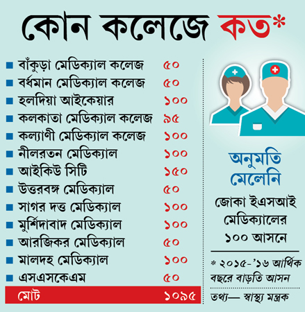 তবে বাকি ১০৯৫টি আসনে ছাত্র ভর্তির অনুমোদন দিয়ে রাজ্য সরকারকে লেখা চিঠিতে এমসিআইয়ের প্রধান জয়শ্রীবেন মেটা খোলাখুলি বলেছেন, ‘মেডিক্যাল কলেজগুলির পরিকাঠামো সংস্কারের কাজে পশ্চিমবঙ্গ প্রথম সারিতে রয়েছে। তাই বাড়তি আসনের অনুমতি দিতে আমরা দেরি করিনি।’ জয়শ্রীবেনের যুক্তি, পরিকাঠামো উন্নয়নে পশ্চিমবঙ্গকে যা-যা করতে বলা হয়েছিল, তা অতি চমৎকার ভাবেই করা হয়েছে। দ্রুত কাজ এগিয়েছে। পরিকাঠামোগত দিক থেকে সামান্য কাজই এখন বাকি। তাঁরা খুবই সন্তুষ্ট।