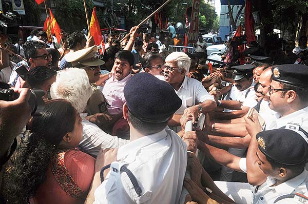 বিক্ষোভ দেখালেন কংগ্রেস এবং বাম প্রতিনিধিরা। —নিজস্ব চিত্র।