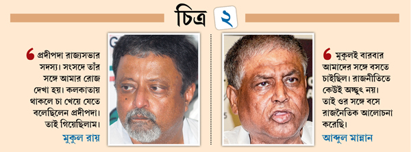 মুকুলের সঙ্গে আলোচনায় মান্নান ছাড়াও ছিলেন প্রাক্তন প্রদেশ কংগ্রেস সভাপতি প্রদীপ ভট্টাচার্য। মুকুল নিজে অবশ্য প্রকাশ্যে এই বৈঠককে গুরুত্ব দিতে নারাজ। তাঁর কথায়, ‘‘ওটা সৌজন্য সাক্ষাৎ। প্রদীপদা রাজ্যসভার সদস্য। সংসদে তাঁর সঙ্গে আমার রোজ দেখা হয়। কলকাতায় থাকলে চা খেয়ে যেতে বলেছিলেন প্রদীপদা। তাই গিয়েছিলাম।’’