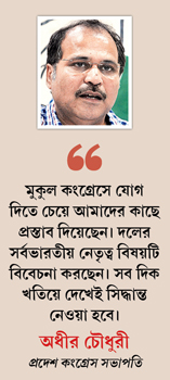 উত্তরে অধীরের বক্তব্য, ‘মুকুলের বিরুদ্ধে কিছু অভিযোগ উঠেছে। কিন্তু কিছু তো প্রমাণ হয়নি। তাঁর শাস্তিও হয়নি। অপরাধ প্রমাণ হলে উনি জেলে যাবেন। কিন্তু এখন আমরা ওঁকে আড়ালও করছি না মদতও দিচ্ছি না।’’ অধীরের মতে, মুকুল তৃণমূলে কোণঠাসা। কিন্তু তিনি রাজনীতিটা করতে চান। কংগ্রেস তাঁকে সেই সুযোগটা করে দিতে আগ্রহী। যদিও মুকুলকে দলে নেওয়ার ব্যাপারটা যে পুরোপুরি হাইকম্যান্ডের উপরে নিভর্রশীল, সেটাও মনে করিয়ে দিচ্ছেন তিনি।
