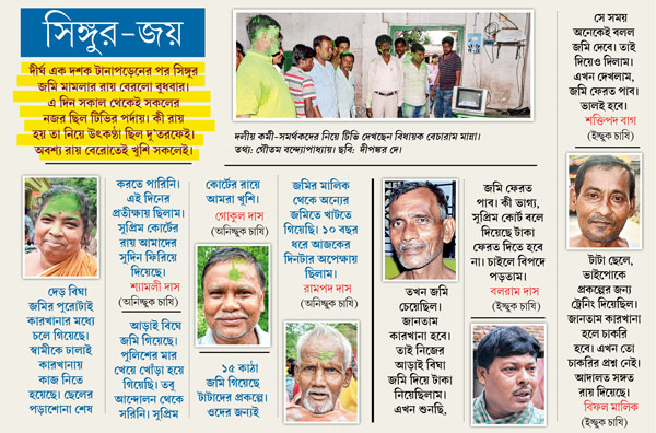 তাঁর দাবি ছিল, ৪০০ একর ফিরিয়ে দেওয়ার। কিন্তু সিঙ্গুরের টাটা গোষ্ঠীর হাতে থাকা প্রায় হাজার একর জমিই কৃষকদের ফিরিয়ে দেওয়ার নির্দেশ দিয়েছে সুপ্রিম কোর্ট।
