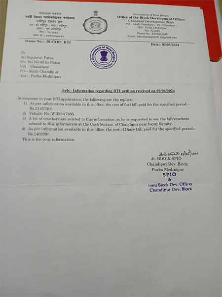 সম্প্রতি চণ্ডীপুরের এক বাসিন্দা সুপ্রভাত পাত্র তথ্য জানার অধিকার আইনে ওই পঞ্চায়েত সমিতির সভাপতির ২০১৮ থেকে ২০২৩ সাল পর্যন্ত মেয়াদকালে গাড়ির তেল বাবদ সরকারি কত টাকা খরচ হয়েছিল, তা জানতে চেয়েছিলেন ব্লক প্রশাসনের কাছে। এই সংক্রান্ত নথিও চেয়েছিলেন সুপ্রভাত। গত ৩ মে ব্লক প্রশাসনের তরফে যুগ্ম বিডিও চিঠি দিয়ে সুপ্রভাতকে জানান যে, ওই মেয়াদে চণ্ডীপুর পঞ্চায়েত সমিতির সভাপতির গাড়ির তেলের বিল বাবদ ২১ লক্ষ ৪৫ হাজার ৭২০ টাকা দেওয়া হয়েছে। আর এই সংক্রান্ত নথি পঞ্চায়েত সমিতির অফিসে ‘ক্যাশ সেকশনে’ রয়েছে।
