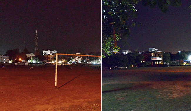 অন্ধকারে ডুবে কলেজ-কলেজিয়েট মাঠ। (ডানদিকে) আলো জ্বলেনি রাঙামাটির মাঠেও। মেদিনীপুরে ছবি তুলেছেন সৌমেশ্বর মণ্ডল।