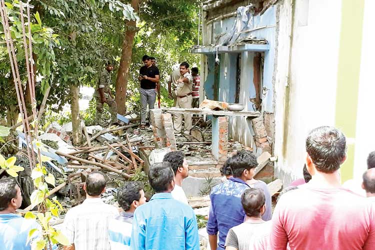 লন্ডভন্ড: মকরামপুরে বিস্ফোরণস্থলে পুলিশের তল্লাশি।