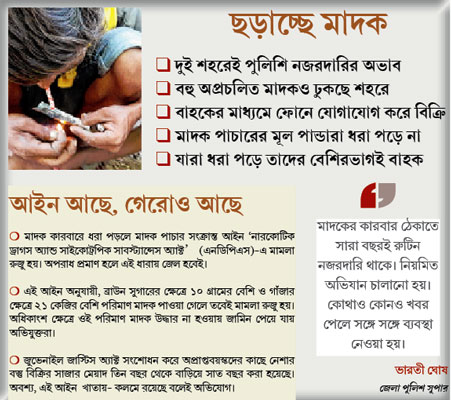 দুই শহরের মানুষেরই অভিযোগ, পুলিশি নিষ্ক্রিয়তার জন্য মাদক কারবারের এই রমরমা। সেই সঙ্গে মাদকাসক্ত লোকজনের দৌলতে শহরে দুষ্কর্মও বাড়ছে। নিষ্ক্রিয়তার কথা অবশ্য মানতে নারাজ পশ্চিম মেদিনীপুরের পুলিশ সুপার ভারতী ঘোষ। তিনি বলেন, ‘‘সারা বছরই রুটিন নজরদারি থাকে। নিয়মিত অভিযান চালানো হয়। কোথাও কোনও খবর পেলে সঙ্গে সঙ্গে ব্যবস্থাও নেওয়া হয়।’’