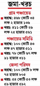 (সেপ্টেম্বর পর্যন্ত)। দেখা যাচ্ছে, গ্রাম পঞ্চায়েতস্তরে বরাদ্দের ৮৩.০১ শতাংশ, পঞ্চায়েত সমিতিস্তরে ৭৩.৩০ শতাংশ খরচ হয়েছে আর জেলা পরিষদস্তরে বরাদ্দের মাত্র ৪০.৬৮ শতাংশ খরচ হয়েছে। জেলা পরিষদ ১০০ কোটি ৮ লক্ষ ৭৪ হাজার ৮০৫ টাকা পেয়েছে— টায়েড ফান্ডে ৫৬ কোটি ১৭ লক্ষ ৪৮ হাজার ২৫২ টাকা, আনটায়েড ফান্ডে ৪৩ কোটি ৯১ লক্ষ ২৬ হাজার