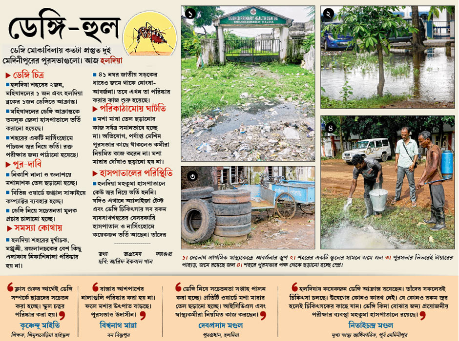 অপরিচিত তরুণদের মুখে এমন কথা শুনে কিছুটা হতচকিত পাতরপাড়ার গৃহবধূরা। সমীর, রণজিত, রাহুল, পীযূষরা ততক্ষণে কাজ শুরু করে দিয়েছেন। সকলেই কলেজ পড়ুয়া। তাঁদের কারও মুখে মাস্ক, হাতে মশানাশক স্প্রে করার যন্ত্র। কোদাল দিয়ে নোংরা সরিয়ে স্প্রে করা হচ্ছে মশানাশক। দ্রুত হাতে উপড়ে ফেলা হচ্ছে আগাছার শিকড়। বাসিন্দাদের কারও জ্বর হয়েছে কি-না লিখে নেওয়া হচ্ছে সেই তথ্যও। অরণ্যশহরের বাসিন্দাদের ডেঙ্গি নিয়ে হাতে কলমে সচেতন করতে পথে নেমেছেন ঝাড়গ্রাম রাজ কলেজের একদল পড়ুয়া।