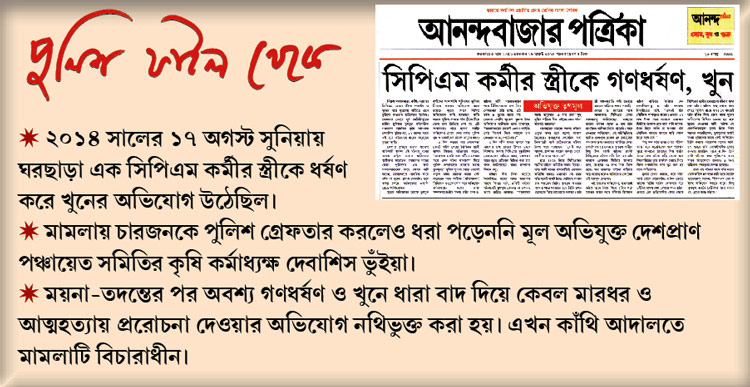 কিন্তু তারপরও কি পুলিশ কিছু করেছে? প্রশ্ন মৃতার পরিবারের। তাঁদের অভিযোগ, ঘটনার পরও অভিযুক্তরা প্রকাশ্য ঘুরে বেরিয়েছে। পুলিশ বলেছে, কাউকে ধরা যাচ্ছে না। সংবাদ মাধ্যমে বারবার লেখালেখি হওয়ায় অবশেযে চারজনকে ধরে পুলিশ। কিন্তু তখনও মূল অভিযুক্ত দেবাশিসকে গ্রেফতার করেনি পুলিশ। দিনের পর দিন এলাকায় ঘুরে বেড়িয়েছে দেবাশিস। আর গ্রেফতারের কথা শুনলেই পুলিশের এক বুলি, ‘‘তদন্ত চলছে। মূল অভিযুক্তের খোঁজ চলছে।’’