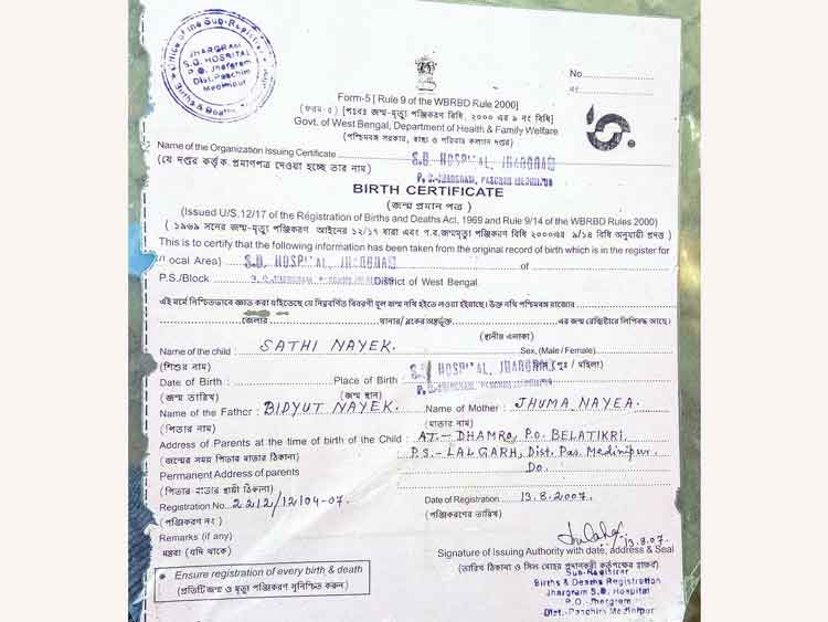 ঝাড়গ্রাম মহকুমা হাসপাতালের দেওয়া এই অসম্পূর্ণ জন্মের শংসাপত্র নিয়েই গ্রামের শিশুশিক্ষা কেন্দ্রে চতুর্থ শ্রেণি পর্যন্ত পড়ে ফেলেছে লালগড়ের সাথী নায়েক। এখন পঞ্চম শ্রেণিতে ভর্তি হতে গিয়ে ধরা পড়েছে ভুল। আর সরকারি হাসপাতালের সেই ভুলের জন্য সাথীর পড়াশোনা অনিশ্চিত হয়ে পড়েছে।