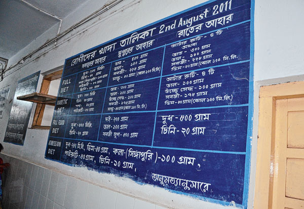 রোগীদের আদর্শ পথ্যর আদর্শ তালিকা কাঁথি হাসপাতালে। তবে তা রোগীদের পাতে পৌঁছায় না বলেই অভিযোগ। ছবি: সোহম গুহ।
