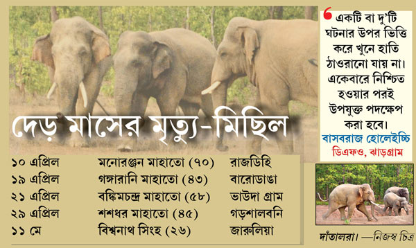 কিন্তু সেখানেও সমস্যা। গোটা আটেক হাতির মধ্যে খুনে হাতিকে চিহ্নিত করতে গিয়ে হিমসিম খাচ্ছেন বনকর্মীরা। এ দিকে প্রতিদিনই রেসিডেন্ট হাতিগুলির তাণ্ডবে ফসল ও সম্পত্তি-ক্ষতির বহর বাড়ছে। সেই সঙ্গে পাল্লা দিয়ে বাড়ছে বাসিন্দাদের ক্ষোভ। মৃত্যুমিছিলের প্রেক্ষিতে কয়েকদিন আগে হাতি তাড়ানোর দাবিতে ঝাড়গ্রামের কলাবনিতে রাজ্যসড়ক অবরোধ করেছিলেন বাসিন্দারা। অভিজ্ঞ বনকর্মীরাও মানছেন, মাত্র দেড় মাসের মধ্যে পাঁচটি মৃত্যুর ঘটনার প্রেক্ষিতে এখনই উপযুক্ত পদক্ষেপ করা না গেলে সমস্যা আরও বাড়বে। ফলে, বিভিন্ন বন সুরক্ষা কমিটির সদস্যদের সঙ্গে নিয়ে বনকর্মীরা পর্যবেক্ষণ ও তথ্য সংগ্রহের কাজ শুরু করেছেন।