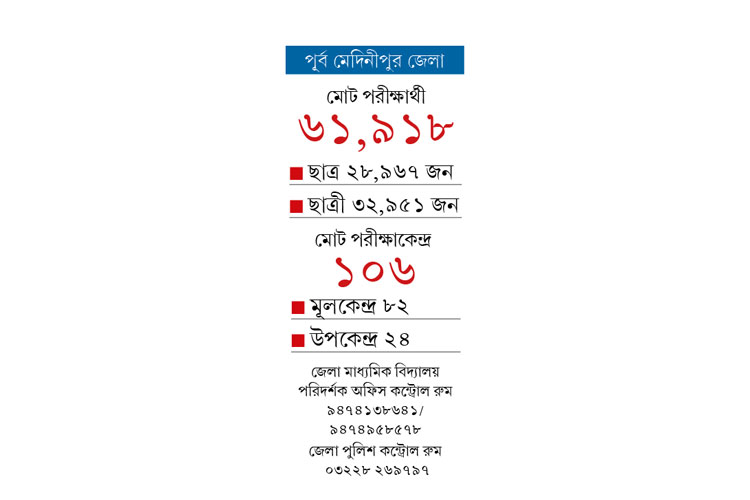 আজ থেকে শুরু মাধ্যমিক পরীক্ষা। পূর্ব মেদিনীপুর জেলায় এবার পরীক্ষার্থীর সংখ্যা ৬১ হাজার ৯১৮ জন। এর মধ্যে ছাত্র ২৮ হাজার ৯৬৭ জন ও ছাত্রীর সংখ্যা ৩২ হাজার ৯৫১ জন। পরীক্ষাকেন্দ্রের সংখ্যা ১০৬টি। এর মধ্যে মূলকেন্দ্র ৮২ টি। উপকেন্দ্র ২৪ টি।