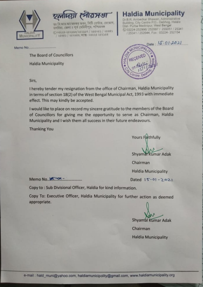এ নিয়ে যোগাযোগ করা হলে হলদিয়ার মহকুমা শাসক অবনিত পুনিয়া বলেন,‘‘আজ দুপুরে হলদিয়া পুরসভার চেয়ারম্যান শ্যামল আদকের ইস্তফাপত্রটি ইমেলেও পেয়েছি। হাতে পেয়েছি হার্ডকপিও। তিনি বোর্ড অফ কাউন্সিলরকেও পদত্যাগপত্র পাঠিয়েছেন। পুরসভার সিইও আছেন। তাঁর নেতৃত্বে বোর্ড অফ কাউন্সিলরের বৈঠকে পদত্যাগপত্রটি গৃহীত হলে, তবেই তা বৈধ হবে।’’