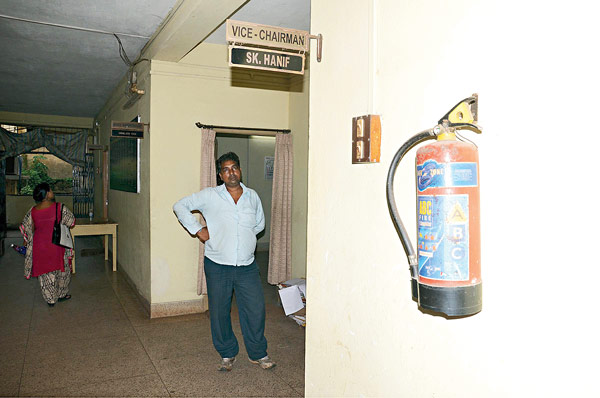 খড়্গপুর পুরভবনে একমাত্র পুরপ্রধানের ঘরের পাশেই লাগানো রয়েছে অগ্নিনির্বাপক যন্ত্র।