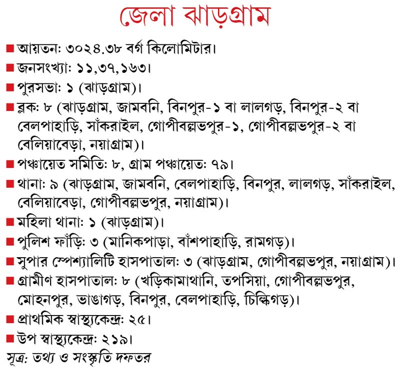 মুখ্যমন্ত্রী মমতা বন্দ্যোপাধ্যায়ের প্রিয় জায়গা জঙ্গলমহল। সেই জঙ্গলমহলের ৮টি ব্লককে নিয়ে পশ্চিম মেদিনীপুর ভেঙে গঠিত হচ্ছে ৩০২৪.৩৮ বর্গ কিলোমিটার আয়তনের পৃথক ঝাড়গ্রাম জেলা। আজ, মঙ্গলবার দুপুরে ঝাড়গ্রাম রাজ কলেজের মাঠে প্রশাসনিক সভার মঞ্চ থেকে ঝাড়গ্রাম জেলার সূচনা করবেন মুখ্যমন্ত্রী।