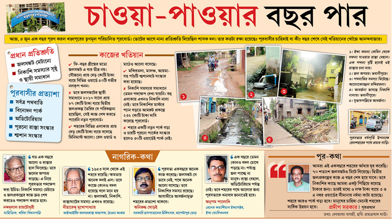 আজ, ৪ জুন এক বছর পূরণ করল খড়্গপুরের তৃণমূল পরিচালিত পুরবোর্ড। ভোটের আগে নানা প্রতিশ্রুতি দিয়েছিল শাসক দল। তার কতটা রক্ষা হয়েছে? পুরবাসীর চাহিদাই বা কী? বছর শেষে সেই খতিয়ানের খোঁজে আনন্দবাজার।